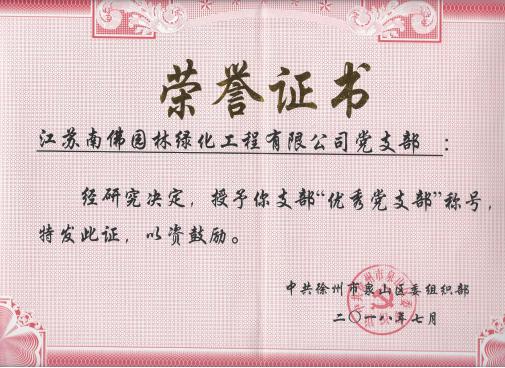 江苏乐鱼在线注册_乐鱼(中国)绿化工程有限公司在2018年度党建工作中成绩优异,业绩突出,荣获“优秀党支部”荣誉称号。