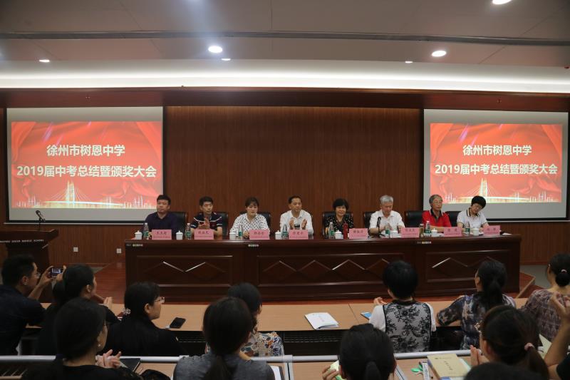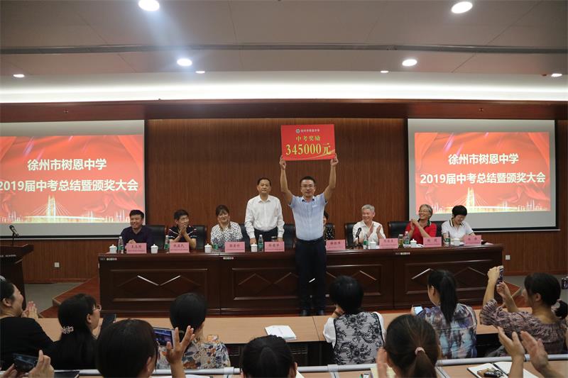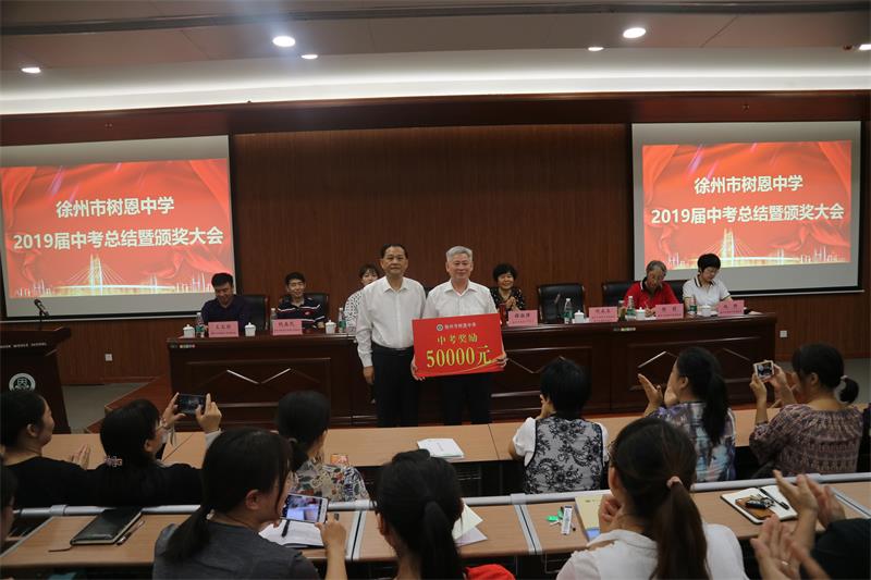 2019年9月27日下午,徐州市树恩中学2019届中考总结暨颁奖大会在高铁校区第一阶梯教室隆重举行,全体初中教师和高中部分教师参加了会议。刘永生校长主持大会。薛淑萍校长作了总结报告,对2019年中考工作进行总结,对2020年中考进行动员部署。徐州市乐鱼在线注册_乐鱼(中国)实业集团张爱萍董事长代表集团对取得优异成绩的中考团队颁发了奖金。原九年级部主任石院老师、现九年级部主任窦道洲老师、高铁校区八年级部主任卢振锦老师、高一年级部主任程建军老师分别代表年级部老师作了大会发言。